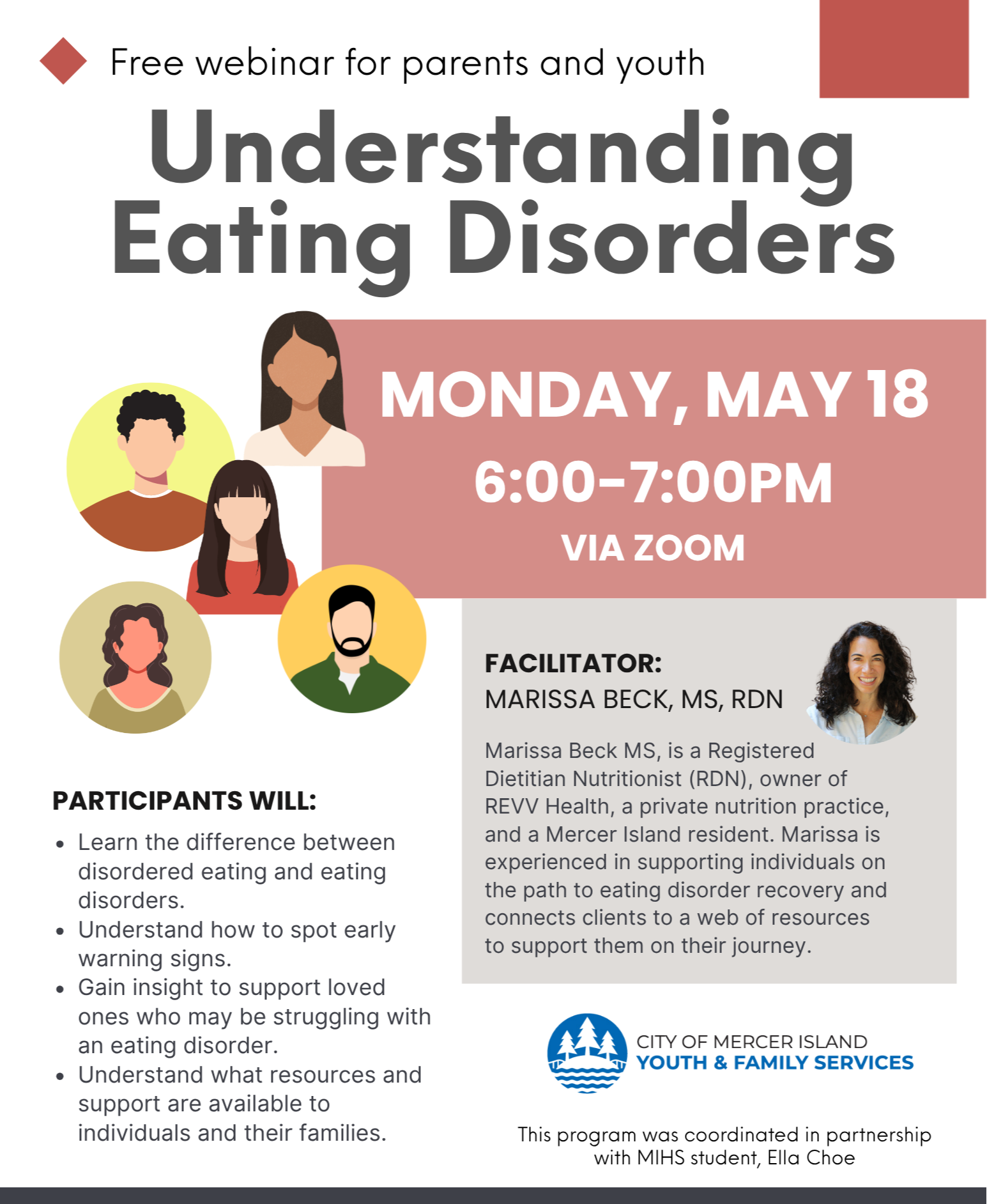 Understanding Eating Disorders Apr 13 Written By MI Healthy Youth Initiative Register for the Webinar There is help. If you or someone you love is in crisis, call 988 for immediate support. For non-emergency, see more resources HERE or call the YFS Confidential Voicemail at (206) 275-7751 to request support MI Healthy Youth Initiative